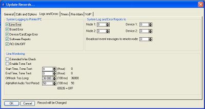| Node 1 + Device 1 | When an exchange generates an error message, it can be sent to one or two destinations. Enter the node and device number to which System log events should be sent. Default value is 0 + 0, which means report to own log port. Example: 4 + 65 means forward system log events to node 4. |
