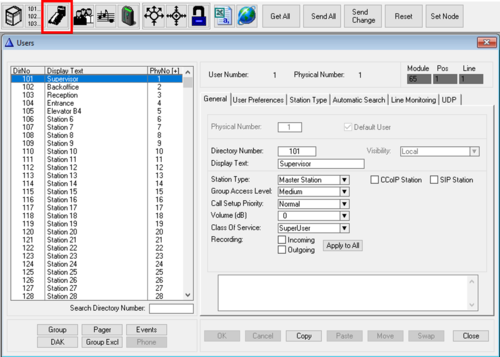 It is possible to define several Users on the same Physical Number. This makes it possible for one station to have several Directory Numbers. This type of configuration is by default disabled, but can be enabled be selecting from the main menu bar View > Users&Stations: Allow editing of physical numbers.