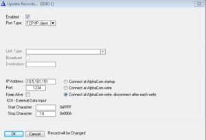 - Enable "Connect at AlphaCom write, disconnect after each write"