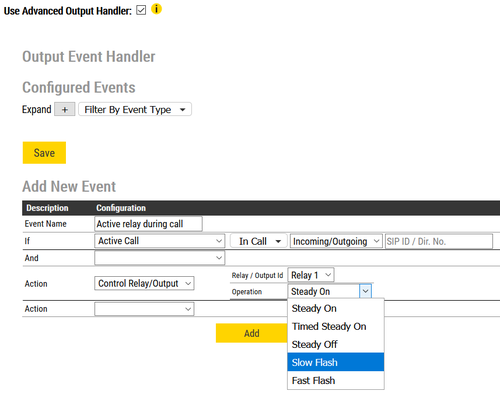 For example if the output is configured to be slow fash during call, fast flash during registration failed and off during idle. If we then have an ongoing call and registration fails, the output will be slow flashing untill the call has ended. After the call has ended, the output will be fast flashing untill the station is registered again, which makes idle action active (the relay should then be off).