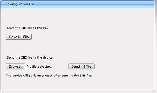 - Backup: From the Tool Bar select Device Actions -> Save Configuration File. Select Save INI File to save the configuration to the PC