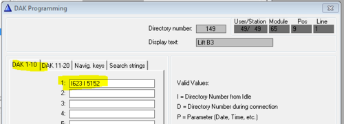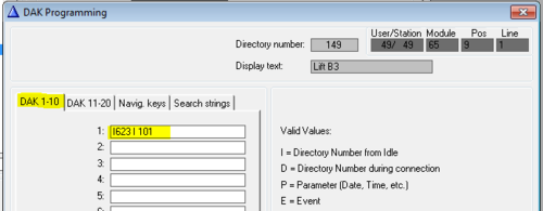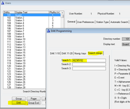 Secondly, enter the target for the Automatic Search. In Users & Stations window, select the intercom station, and press the DAK button. Select the Search Strings tab, and enter the Call Request code to the Dummy Station.