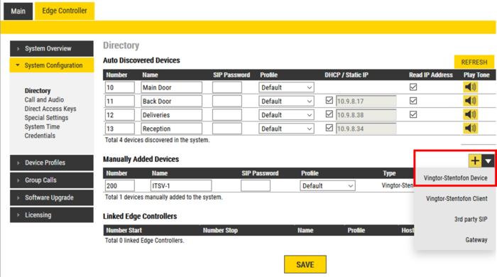 - From the menu Edge Controller > System Configuration > Directory, under the Manually Added Devices section, press the "+" button
