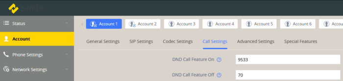 In the Account settings, select the actual account. Under the Call Settings tab find the fields for DND Call feature On and DND call feature Off: