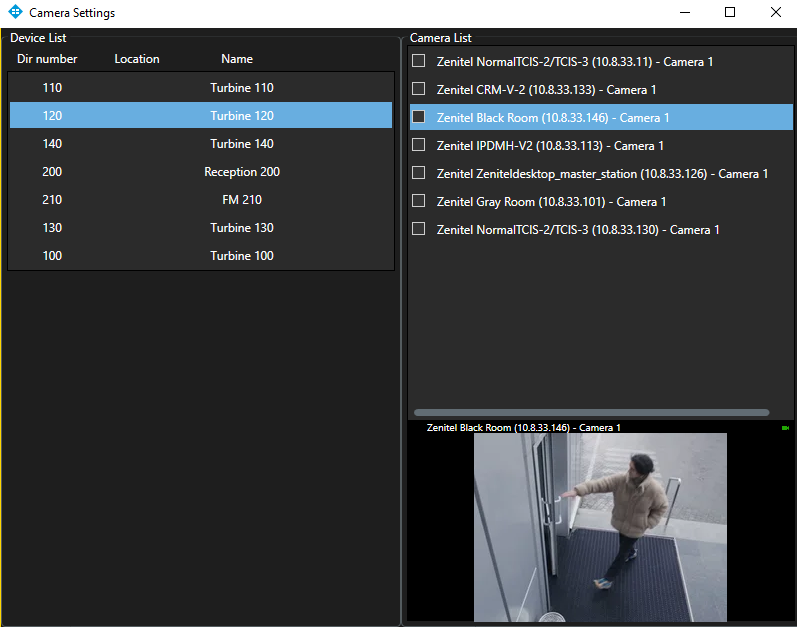 - Click on an item in the right list to preview the video feed from that camera.