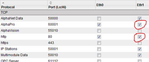 • For Eth1, enable the ports for AlphaWeb (http, port 80) and for AlphaPro