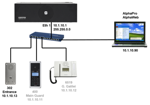 - Connect the IP substation and the AlphaCom XE (Eth1) to the same network switch