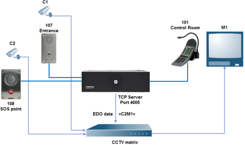 - When a Call Request (= mail) is received at the Control Room, the AlphaCom should send ASCII text on the EDO port 1 to the CCTV system, telling which camera to connect to which monitor.