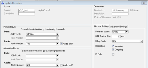 In Exchange & System > Net Routing use the Insert button to create a route between the AlphaCom and the SIP Trunking node. Set Preferred codec to G711u and RTP Packet Size to 20 ms.