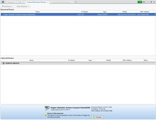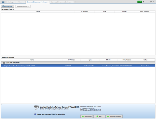 - The Discovery window will open and automatically find all ONVIF compliant devices. Click on the device and then click Connect... in order to connect device with the Avigilon server.