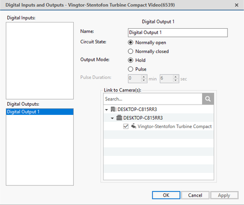 - Configure the relay with desired behavior, consult Avigilon manual/help for detailed description of the options available. When done click on Apply and close the setup.