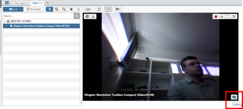 To open the audio stream, the device must be added to the main Avigilon screen and stream should be running. Hover over the stream and the Listen icon should appear in the lower right corner. Click on it to activate audio.