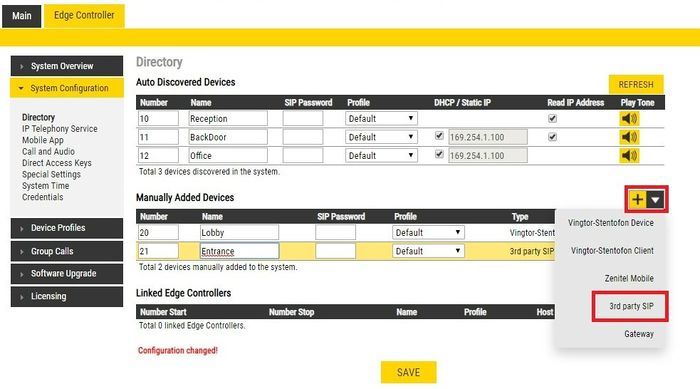 - From the menu Edge Controller > System Configuration > Directory, under the Manually Added Devices section, press the "+" button