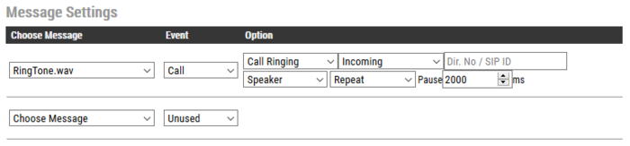 An audio message can be played on incoming, outgoing or incoming/outgoing call direction. It can in addition be filtered by directory number (SIP ID) or Ringlist call [ringlist0, ringlist1, ringlist2]. The following call events are supported: