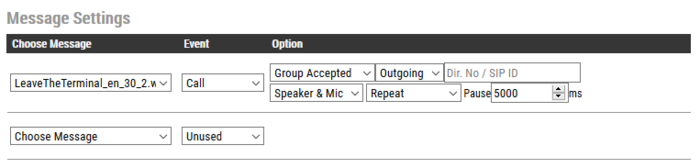 The audio message is always routed to the loudspeaker of the station, but there is an option to send the audio message as a "Microphone" signal as well. This means that the audio message can be transmitted to the other party during an established call. The "Speaker & Mic" option is feasible for the Call Events Call Accepted and Group Accepted. When "Speaker & Mic" option is selected, the microphone signal will be disabled while the message is playing. Once the message has stopped playing, the microphone will be enabled again.