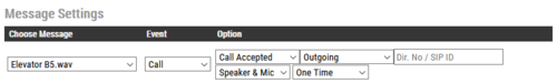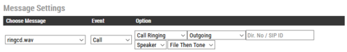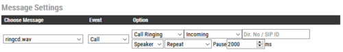 An audio message can be played on incoming, outgoing or incoming/outgoing call direction. It can in addition be filtered by directory number (SIP ID) or Ringlist call [ringlist0, ringlist1, ringlist2]. The following call events are supported: