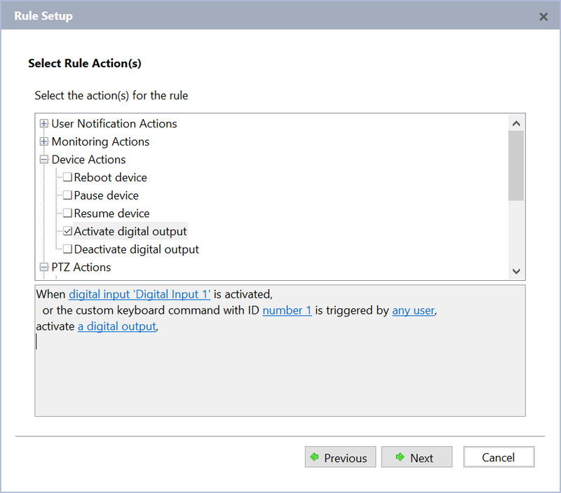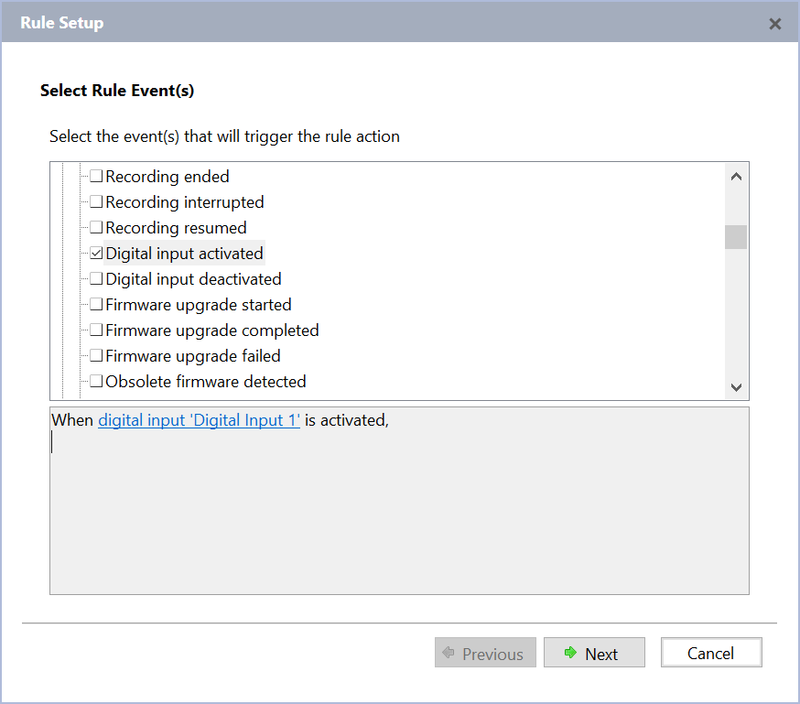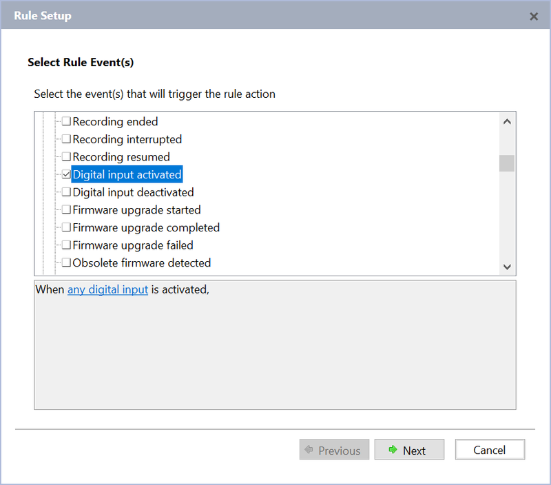 First we select an event to trigger the rule. In this example we choose "Digital input activated"
