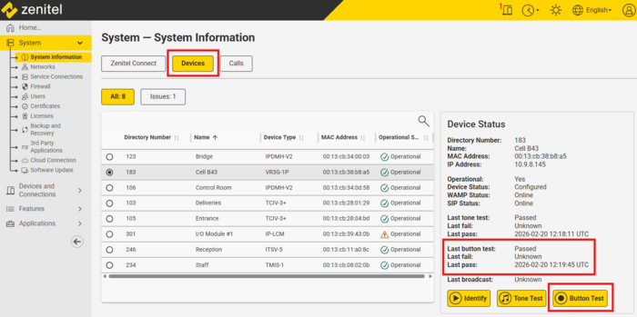 - The Zenitel Event node Zenitel Extended State can be used to read the result of the Button Test.