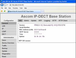 The Ethernet port is by default set to obtain an IP address automatically (DHCP) if connected to a LAN network with DHCP server. To access the embedded web server of the IP-Dect unit, start your internet browser (e.g. Internet Explorer) and in the address field enter ipbs-xx-xx-xx, where xx-xx-xx is the last six digits of the MAC address printed at the rear of the IP-Dect unit. The INFO page should now be displayed:
