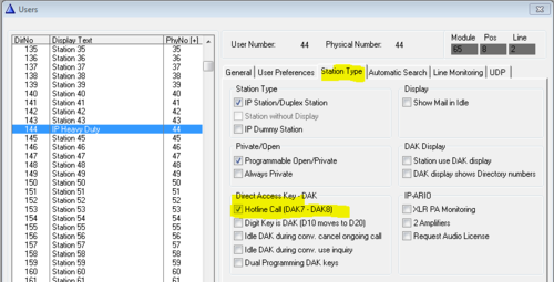 Enable the hotline function by selecting the hotline station in the listbox in Users & Stations, select the Station Type tab, and check the Hotline flag: