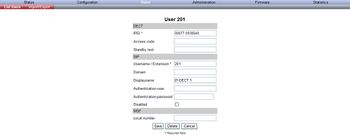 On the Configuration/SIP page you define general SIP settings, information about authentication, DTMF signalling, message waiting indication and