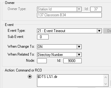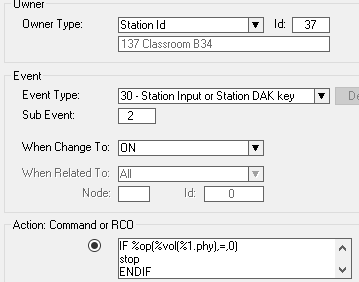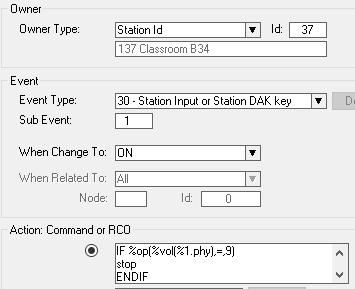 In Users & Stations window, select the School Intercom from the list box and select the button Events. Insert a new event with the following parameters (you can copy/paste the action commands):