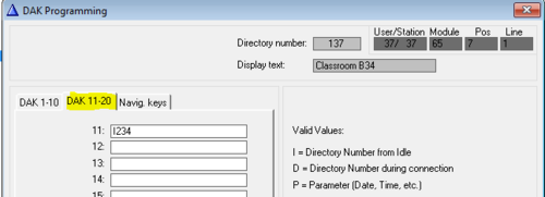 The emergency button is configured from AlphaPro. In Users & Stations window, select the School Intercom from the list box and select the button DAK. Enter the call destination on DAK 11.