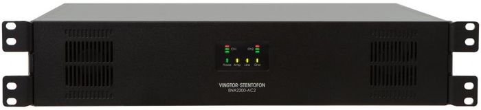 The ENA2200-AC2 Amplifier is a class D amplifier providing 2 x 200W that can register to the ICX-AlphaCom server or a SIP server over an IP network. It operates from a 115/230 VAC supply and is designed to survive minor interruptions to the power supply.