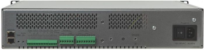 Configurable control inputs/outputs and audio inputs can be utilized locally or controlled by the system, such as using audio input for background music. The audio line input can also be configured in a Hardware Bypass mode, forwarding audio to the 100V channels even without a server available, adding redundancy and flexibility to the amplifier's functionality.