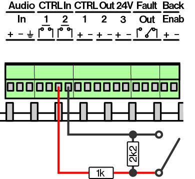 The resistor connected in series with the external switch/relay shall have a value of 1 kΩ, while the resistor connected in parallel shall be 2.2 kΩ.