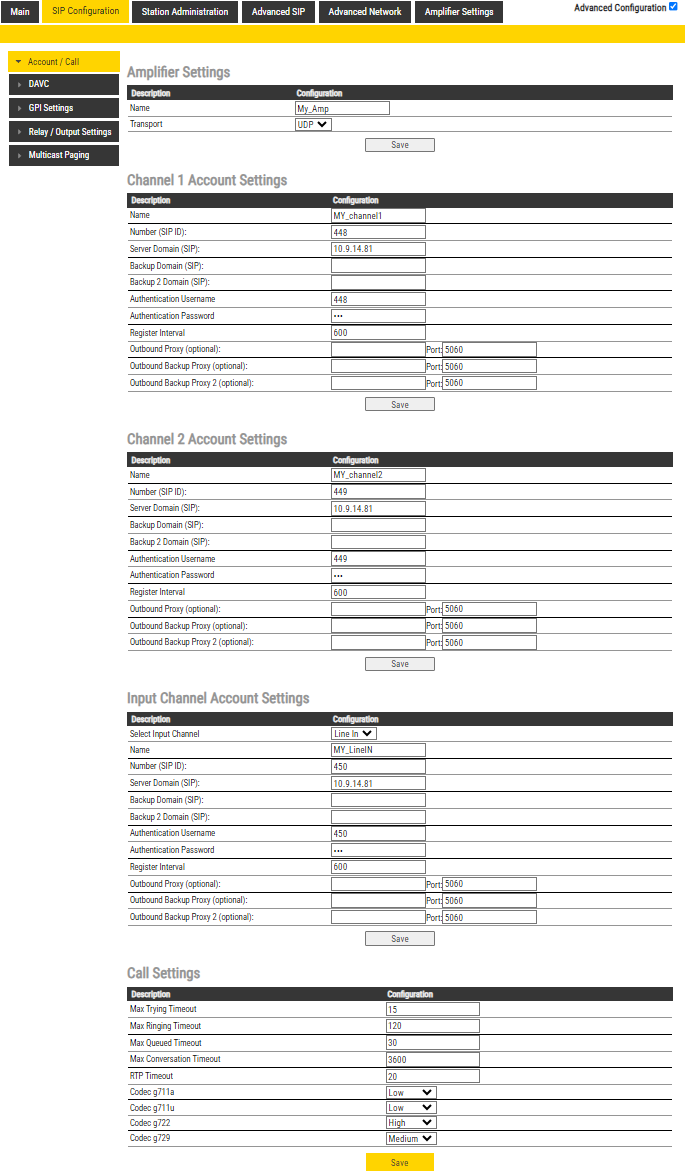 Select SIP Configuration -> Account/Call to access the page for configuring the SIP Account Settings.