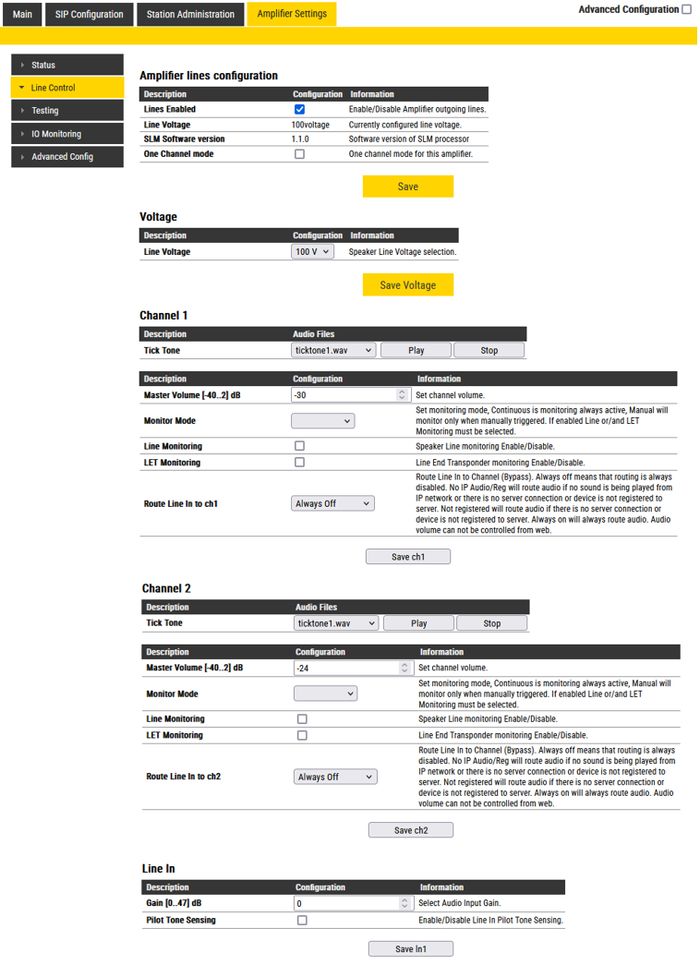 - Lines Enabled: Enable/Disable Amplifier outgoing lines.