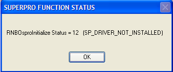 Error message "SuperPro initialization failed" or "RNBOsproInitialize Status = 12" when starting AlphaPro first time after installation.