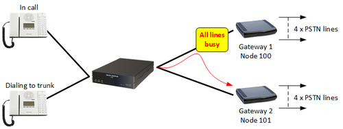 When a user dials "0", the call will go out on gateway 1. If all lines on gateway 1 are busy, the ICX will automatically reroute the call out on gateway 2.