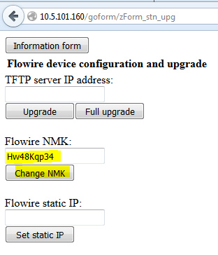 To set a new NMK in FCDC1 or FCDC2, select the button "Upgrade form", and enter a new Flowire NMK: