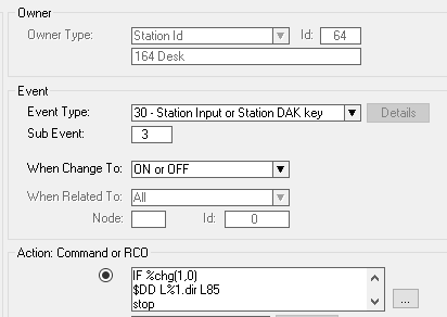 The following event will activate group call 85 when the DAK key number 3 (= Subevent 3) is pressed, and cancel when the key is released.