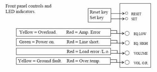 - Line error, amplifier error, load error, overheating, GND fault and overload