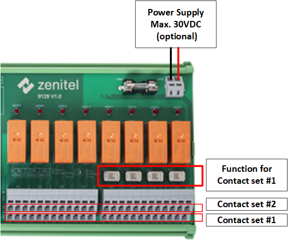 Relay 5 to 8 has a corresponding output selector switch. With this switch one can select if the Contact Set #1 should provide dry contacts, or if it should forward power from the power forwarding connector. Contact Set #2 will always provide dry contacts, regardless of the position of the output selector switch.