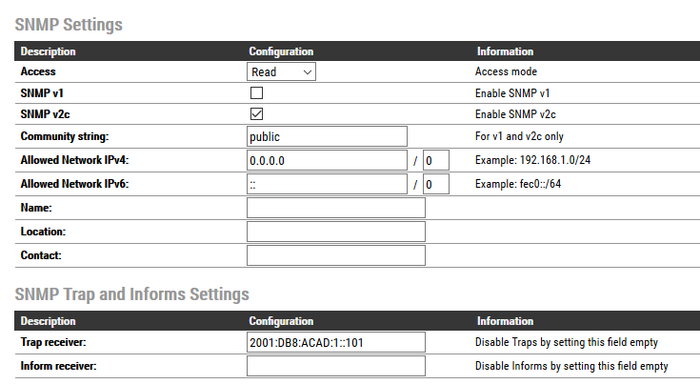 - Allowed Network IPv6 – with this option we can control from which IPv6 network address we will allow access to Turbine's SNMP data. In this example, we will allow anyone if we specify ::/0