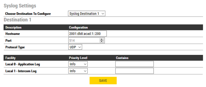 Select Station Administration > Logging. Under section Syslog Settings configure IPv6 address or DNS name of Syslog server, configured already for accepting system logs on specified IPv6 address, transport protocol and port. Save changes, a reboot is not required.