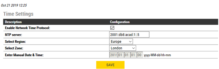 Turbine station in SIP mode will be able to synchronize Time with NTP server listening on IPv6 address. To configure Time Server on Turbine, select SIP Configuration > Time and configure DNS name or IPv6 address of desired NTP server.