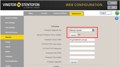 - Select Maintenance > Upgrade, and choose "Firmware Upgrade Via:" Manual Upload