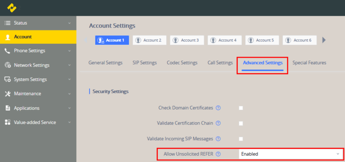 To be able to use the ITSV-2 as an operator intercom, select the Account in use, select the Advanced Settings tab, and set Allow Unsolicited REFER = Enabled