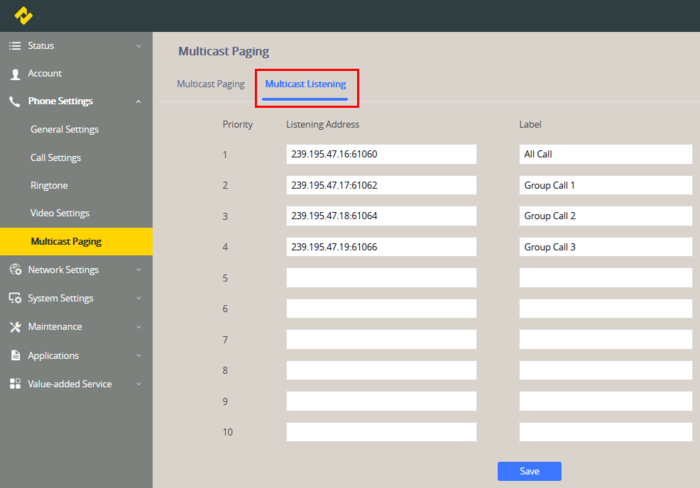 Navigate to Phone Settings > Multicast Paging > Multicast Listening tab, and enter the multicast address(es) found in the Edge Controller as indicated in the screen shot below: