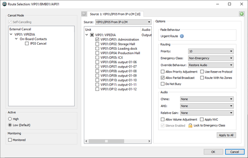 The Route will be configured from the audio input that the IP-LCM is connected to to one or more audio outputs.
