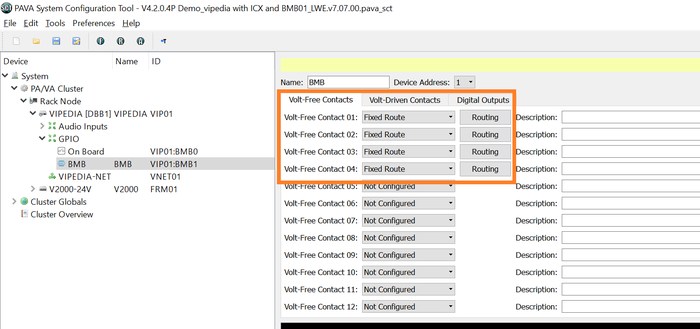 The input of the BMB01 have to be configured to select the appropriate routes. In the tab Volt-free contacts you choose for every input you use "fixed route".