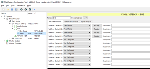 In the SCT (System Config Tool) the BMB01 inputs will be setup with fixed routes on the Volt-Free Contacts. The RCO that is triggered on the IP-LCM is connected to an input of the BMB01. By using a Fixed Route the Vipedia will then set up a correct route to the outputs and zones.
