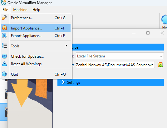 - Open VirtualBox and click on "File" tab, followed by "Import Appliance" .