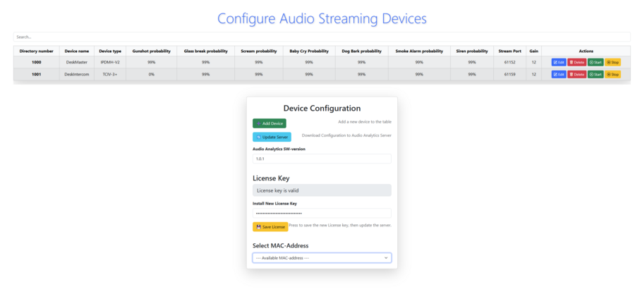 Pressing on Add Device will open a new interface for adding device, on the left side is device configuration such as directory number, gain and stream port and on right side is event probability tuning.