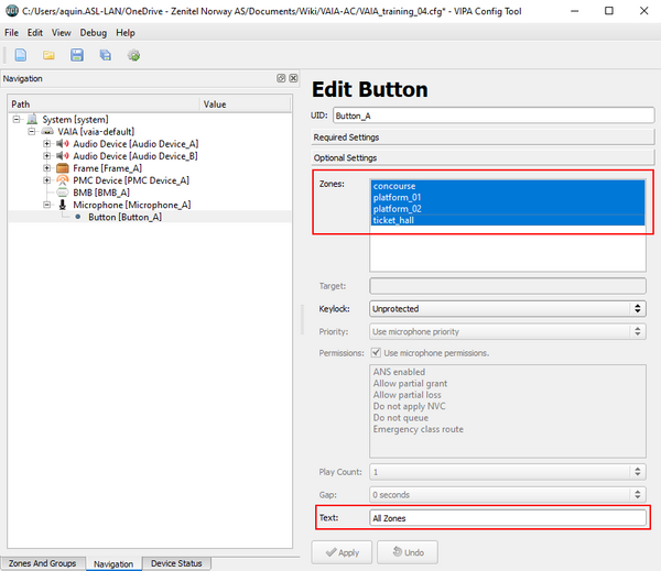 This button selects PA zone(s) for an announcement. A single zone or a list of zones is defined in the zones property, where each zone equates to an audio output on a VIPA device (local or remote). After the button is pressed, a green zone selection LED will flash to indicate the zone(s) is selected. The main PTT button is then pressed to make a live announcement to the selected zones.